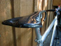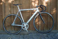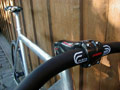 Update, Summer 2007: I built this to be legal for track racing, and a few bolts later (bars and brake), more aggressive for the road, hence the two different configurations...alas, I never got around to racing it, and used the deda pista bars on Tresa's FG. The 'street' setup pictured above is way more fun. I got a settlement from getting hit, and though I wanted a $10k Colnago, I settled for a few ounces of carbon fiber. It now sports a carbon fiber saddle, stem, straight bar, and seat post, plus I put a freewheel and rear brake on it because it seems like all the kids these days are riding fixed. Plus I don't care how "one with your bike" you are on a fg, you can be way more aggressive on a fw ss...and aggressive is uh, how do I put this...faster. Don't get me started on the hordes of fg hipsters coasting around at 3 mph.